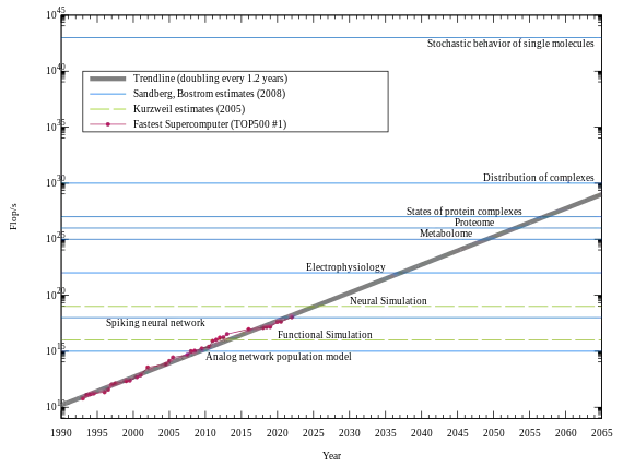 In 1997, Kurzweil looked at various estimates for the hardware required to equal the human brain and adopted a figure of 1016 computations per second (cps).[lower-alpha 5] (For comparison, if a "computation" was equivalent to one "floating-point operation" – a measure used to rate current supercomputers – then 1016 "computations" would be equivalent to 10 petaFLOPS, achieved in 2011, while 1018 was achieved in 2022.) He used this figure to predict the necessary hardware would be available sometime between 2015 and 2025, if the exponential growth in computer power at the time of writing continued.