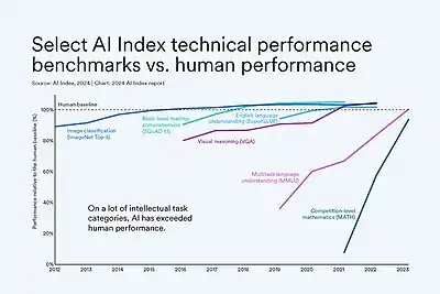 However, many of these tasks can now be performed by modern large language models. According to Stanford University's 2024 AI index, AI has reached human-level performance on many benchmarks for reading comprehension and visual reasoning.[36]
