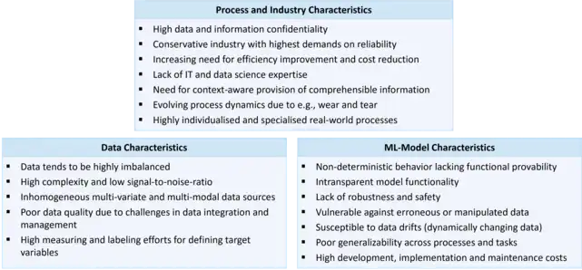 In contrast to entirely virtual systems, in which ML applications are already widespread today, real-world production processes are characterized by the interaction between the virtual and the physical world. Data is recorded using sensors and processed on computational entities and, if desired, actions and decisions are translated back into the physical world via actuators or by human operators.[6] This poses major challenges for the application of ML in production engineering systems. These challenges are attributable to the encounter of process, data and model characteristics: The production domain's high reliability requirements, high risk and loss potential, the multitude of heterogeneous data sources and the non-transparency of ML model functionality impede a faster adoption of ML in real-world production processes.