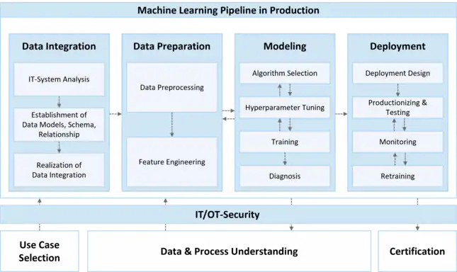The Machine Learning Pipeline in Production is a domain-specific data science methodology that is inspired by the CRISP-DM model and was specifically designed to be applied in fields of engineering and production technology.[11] To address the core challenges of ML in engineering – process, data, and model characteristics – the methodology especially focuses on use-case assessment, achieving a common data and process understanding data integration, data preprocessing of real-world production data and the deployment and certification of real-world ML applications.