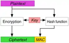 - Output: ciphertext and authentication tag (message authentication code or MAC).