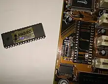 Another type of firmware chip was found on the IBM PC AT and early compatibles. In the AT, the keyboard interface was controlled by a microcontroller with its own programmable memory. On the IBM AT, that was a 40-pin socketed device, while some manufacturers used an EPROM version of this chip which resembled an EPROM. This controller was also assigned the A20 gate function to manage memory above the one-megabyte range; occasionally an upgrade of this "keyboard BIOS" was necessary to take advantage of software that could use upper memory.