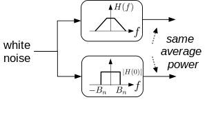 The noise equivalent bandwidth (or equivalent noise bandwidth (enbw)) of a system of frequency response is the bandwidth of an ideal filter with rectangular frequency response centered on the system's central frequency that produces the same average power outgoing when both systems are excited with a white noise source. The value of the noise equivalent bandwidth depends on the ideal filter reference gain used. Typically, this gain equals at its center frequency,[6] but it can also equal the peak value of .