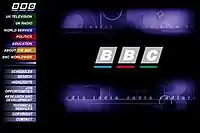 As part of the rebrand, BBC website pages all displayed a standard navigation bar across the top of the screen, offering category-based navigation: Categories, TV, Radio, Communicate, Where I Live, A-Z Index and a search function.[18] The navbar was designed to offer a similar navigation system to the i-bar on BBCi interactive television.