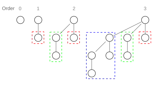 To merge two heaps more generally, the lists of roots of both heaps are traversed simultaneously in a manner similar to that of the merge algorithm, in a sequence from smaller orders of trees to larger orders. When only one of the two heaps being merged contains a tree of order , this tree is moved to the output heap. When both of the two heaps contain a tree of order , the two trees are merged to one tree of order so that the minimum-heap property is satisfied. It may later become necessary to merge this tree with some other tree of order in one of the two input heaps. In the course of the algorithm, it will examine at most three trees of any order, two from the two heaps we merge and one composed of two smaller trees.[1][3]