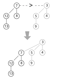 The operation of merging two heaps is used as a subroutine in most other operations. A basic subroutine within this procedure merges pairs of binomial trees of the same order. This may be done by comparing the keys at the roots of the two trees (the smallest keys in both trees). The root node with the larger key is made into a child of the root node with the smaller key, increasing its order by one:[1][3]