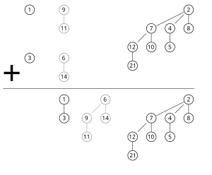 Because each binomial tree in a binomial heap corresponds to a bit in the binary representation of its size, there is an analogy between the merging of two heaps and the binary addition of the sizes of the two heaps, from right-to-left. Whenever a carry occurs during addition, this corresponds to a merging of two binomial trees during the merge.[1][3]