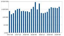 Bitcoin Cash trades on digital currency exchanges using the Bitcoin Cash name and the BCH currency code for the cryptocurrency.[29][30][31] On 26 March 2018, OKEx removed all Bitcoin Cash trading pairs except for BCH/BTC, BCH/ETH and BCH/USDT due to "inadequate liquidity".[15] As of May 2018, daily transaction numbers for Bitcoin Cash are about one-tenth of those of bitcoin.[15] Coinbase listed Bitcoin Cash on 19 December 2017 and the Coinbase platform experienced price abnormalities that led to an insider trading investigation.[32] As of August 2018, Bitcoin Cash payments are supported by payment service providers such as BitPay, Coinify and GoCoin.[33]