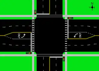 As Kainen (1990) described, a book embedding may be used to describe the phases of a traffic signal at a controlled intersection. At an intersection, the incoming and outgoing lanes of traffic (including the ends of pedestrian crosswalks and bicycle lanes as well as lanes for motor vehicles) may be represented as the vertices of a graph, placed on the spine of a book embedding in their clockwise order around the junction. The paths through the intersection taken by traffic to get from an incoming lane to an outgoing lane may be represented as the edges of an undirected graph. For instance, this graph might have an edge from an incoming to an outgoing lane of traffic that both belong to the same segment of road, representing a U-turn from that segment back to that segment, only if U-turns are allowed at the junction. For a given subset of these edges, the subset represents a collection of paths that can all be traversed without interference from each other if and only if the subset does not include any pair of edges that would cross if the two edges were placed in a single page of a book embedding. Thus, a book embedding of this graph describes a partition of the paths into non-interfering subsets, and the book thickness of this graph (with its fixed embedding on the spine) gives the minimum number of distinct phases needed for a signalling schedule that includes all possible traffic paths through the junction.[52]