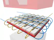 A bubble memory device consists of a case, that houses a PCB with connections to one or more bubble memory chips which may be translucent. The area around the chips on the PCB is surrounded by two windings made of copper wire or other electrically conductive material, that mostly wrap the area, leaving some space for the PCB to pass through the windings and connect to the chips. The windings are wound in directions opposite to each other, for example one winding has wires oriented along the X axis and the other winding has wires along the Z axis. The windings, in turn, are surrounded by two permanent magnets, one below and another above the windings. This forms an assembly that is housed inside the case which acts as a magnetic shield and forms a magnetic return path for the magnetic field from the magnets. The permanent magnets are critical; they create a static (DC, direct current) magnetic field, used as a bias field that enables the contents of the memory to be retained, in other words they allow bubble memories to be non-volatile. If the magnets are removed, all bubbles will disappear and thus all contents will be deleted. The windings create a rotating magnetic field parallel to the orientation of the bubble memory, at around 100 to 200 kHz. This will move or drive the bubbles in the magnetic film in a somewhat circular fashion, guided or restrained by the propagation elements. For example, the rotating magnetic field can force the bubbles to constantly circulate around loops, which may be elongated and are defined by the locations of the guiding elements.[3][6]