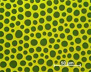 To allow the bubbles to move around the bubble chips and to guide them through the chip, the chips have some sort of pattern made of ferromagnetic metal that can include for example asymmetrical chevrons.[3] For example, the bubbles can move around the edges of the chevrons. The patterns can be called propagation elements as they allow the bubbles to move or propagate across it. They define pathways for the bubbles to be stored and retrieved for reading and the rotating magnetic field moves the bubbles along these paths. For bubble memory, a material like Gadolinium Gallium Garnet is used as the substrate in the chips.[3] On top of the substrate is a magnetic film (bubble host or bubble film/layer)[5][4] such as a Gadolinium-containing garnet[5] or more often, single crystal substituted yttrium iron garnet[4] which holds the magnetic bubbles, that is grown epitaxially with liquid-phase epitaxy with lead oxide flux as the liquid with yttrium oxide and other oxides, and then the film is doped with ion-implantation of one or several elements, to reduce undesirable characteristics.[5][3] The epitaxy process would be carried out with a platinum crucible and wafer holder.[4] The chevrons and other parts are built on top of the film.[3] The propagation elements, including the chevrons, can be made of a material such as Nickel-Iron permalloy. The materials in bubble memories are chosen mainly for their magnetic properties.[3] Gadolinium Gallium Garnet is used as a substrate because it can support the epitaxial growth of magnetic garnet films, and is nonmagnetic,[4] although some bubble memories used Nickel-Cobalt substrates instead.
