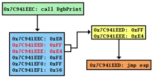 In practice a program may not intentionally contain instructions to jump to a particular register. The traditional solution is to find an unintentional instance of a suitable opcode at a fixed location somewhere within the program memory. Figure E on the left contains an example of such an unintentional instance of the i386 jmp esp instruction. The opcode for this instruction is FF E4.[12] This two-byte sequence can be found at a one-byte offset from the start of the instruction call DbgPrint at address 0x7C941EED. If an attacker overwrites the program return address with this address the program will first jump to 0x7C941EED, interpret the opcode FF E4 as the jmp esp instruction, and will then jump to the top of the stack and execute the attacker's code.[13]