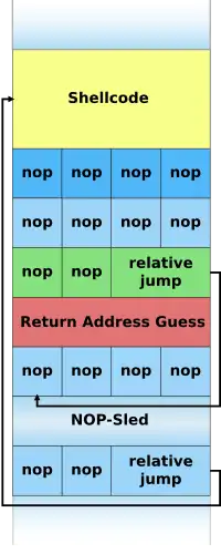 A NOP-sled is the oldest and most widely known technique for exploiting stack buffer overflows.[7] It solves the problem of finding the exact address of the buffer by effectively increasing the size of the target area. To do this, much larger sections of the stack are corrupted with the no-op machine instruction. At the end of the attacker-supplied data, after the no-op instructions, the attacker places an instruction to perform a relative jump to the top of the buffer where the shellcode is located. This collection of no-ops is referred to as the "NOP-sled" because if the return address is overwritten with any address within the no-op region of the buffer, the execution will "slide" down the no-ops until it is redirected to the actual malicious code by the jump at the end. This technique requires the attacker to guess where on the stack the NOP-sled is instead of the comparatively small shellcode.[8]