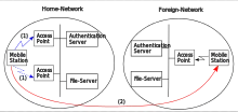 - Internal roaming: The mobile station (MS) moves from one access point (AP) to another AP within a home network if the signal strength is too weak. An authentication server performs the re-authentication of MS via 802.1x (e.g. with PEAP). The billing of QoS is in the home network. A MS roaming from one access point to another often interrupts the flow of data between the MS and an application connected to the network. The MS, for instance, periodically monitors the presence of alternative APs (ones that will provide a better connection). At some point, based on proprietary mechanisms, the MS decides to re-associate with an AP having a stronger wireless signal. The MS, however, may lose a connection with an AP before associating with another access point. To provide reliable connections with applications, the MS must generally include software that provides session persistence.[6]