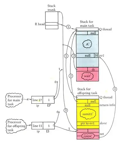 The B5000 line also were pioneers in having two processors connected together on a high-speed bus as master and slave. In the B6000, B7000 and B8000 lines the processors were symmetric. The B7000 line could have up to eight processors, as long as at least one was an I/O module. RDLK (ReaD with LocK) is a very low-level way of synchronizing between processors. RDLK operates in a single cycle. The higher level mechanism generally employed by user programs is the EVENT data type. The EVENT data type did have some system overhead. To avoid this overhead, a special locking technique called Dahm locks (named after a Burroughs software guru, Dave Dahm) can be used. Dahm locks used the READLOCK ALGOL language statement which generated a RDLK operator at the code level.
