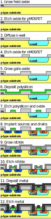 Complementary metal–oxide–semiconductor (CMOS, pronounced "sea-moss", /siːmɑːs/, /-ɒs/) is a type of metal–oxide–semiconductor field-effect transistor (MOSFET) fabrication process that uses complementary and symmetrical pairs of p-type and n-type MOSFETs for logic functions.[1] CMOS technology is used for constructing integrated circuit (IC) chips, including microprocessors, microcontrollers, memory chips (including CMOS BIOS), and other digital logic circuits. CMOS technology is also used for analog circuits such as image sensors (CMOS sensors), data converters, RF circuits (RF CMOS), and highly integrated transceivers for many types of communication.