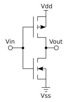 The adjacent image shows what happens when an input is connected to both a PMOS transistor (top of diagram) and an NMOS transistor (bottom of diagram). Vdd is some positive voltage connected to a power supply and Vss is ground. A is the input and Q is the output.