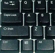 In most cases, the status of the Caps Lock key only changes the meaning of the alphabet keys, not that of any other key. Microsoft Windows enforces this behavior only when a keyboard layout for a Latin-based script is active, e.g. the "English (United States)" layout but not the "Persian" layout. On certain non-QWERTY keyboard layouts, such as the French AZERTY and the German QWERTZ, Caps Lock still behaves like a traditional Shift lock, i.e., the keyboard behaves as if the Shift key is held down, causing the keyboard to input the alternative values of the keys; example the "5" key generates a "%" when Caps Lock is pressed. This is not true for the layout "German (IBM)".