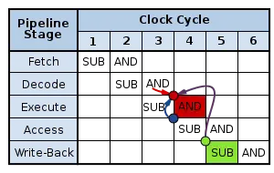 Note that the data can only be passed forward in time - the data cannot be bypassed back to an earlier stage if it has not been processed yet. In the case above, the data is passed forward (by the time the AND is ready for the register in the ALU, the SUB has already computed it).