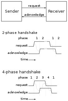 - two-phase handshake (also known as two-phase protocol, Non-Return-to-Zero (NRZ) encoding, or transition signaling): Communications are represented by any wire transition; transitions from 0 to 1 and from 1 to 0 both count as communications.