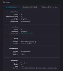Cloudflare, Inc. is an American company that provides content delivery network services, cloud cybersecurity, DDoS mitigation, Domain Name Service, and ICANN-accredited[3] domain registration services.[4][5][6] Cloudflare's headquarters are in San Francisco, California.[4] According to The Hill, Cloudflare is used by more than 20% of the Internet for its web security services, as of 2022.[7]