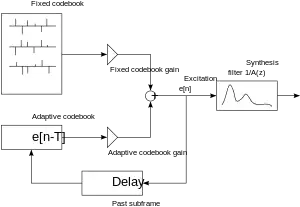 where is the fixed (a.k.a. stochastic or innovation) codebook contribution and is the adaptive (pitch) codebook contribution. The fixed codebook is a vector quantization dictionary that is (implicitly or explicitly) hard-coded into the codec. This codebook can be algebraic (ACELP) or be stored explicitly (e.g. Speex). The entries in the adaptive codebook consist of delayed versions of the excitation. This makes it possible to efficiently code periodic signals, such as voiced sounds.