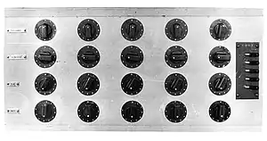 ![]() A Colossus Mark 2 computer being operated by Wrens.[lower-alpha 1] The slanted control panel on the left was used to set the "pin" (or "cam") patterns of the Lorenz. The "bedstead" paper tape transport is on the right. | |