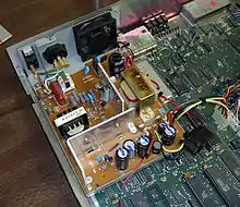 The C128's power supply is different from the C64's design. Although it is much larger, the new power supply is equipped with cooling vents and a replaceable fuse.