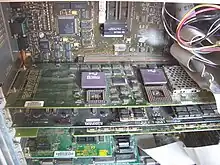 The SystemPro, along with the simultaneously released Compaq Deskpro 486, was one of the first two commercially available computer systems containing the new EISA bus. The SystemPro was also one of the first PC-style systems specifically designed as a network server, and as such was built from the ground up to take full advantage of the EISA bus. It included such features as multiprocessing (the original systems were asymmetric-only), hardware RAID, and bus-mastering network cards. All models of SystemPro used a full-height tower configuration, with eight internal hard drive bays. As well as the provision for an 80387 maths coprocessor chip, the processor card also included a socket for a Weitek maths coprocessor chip. Support for the Weitek function needed to be especially provided in the application, it did not use the same instruction set as the 80387 chip. The Weitek socket (empty) is the multi-pin triple-row socket to the right on the CPU-board closeup.