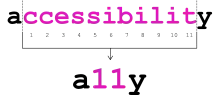 Accessibility is often abbreviated as the numeronym a11y, where the number 11 refers to the number of letters omitted.[3] This parallels the abbreviations of internationalization and localization as i18n and l10n, respectively. Moreover, a11y is also listed on the USPTO Supplemental Register under Accessibility Now, Inc.[3]