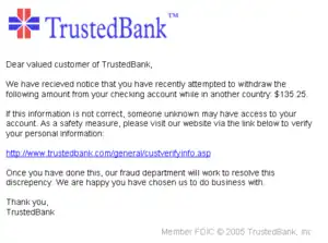Phishing is the attempt of acquiring sensitive information such as usernames, passwords, and credit card details directly from users by deceiving the users.[28] Phishing is typically carried out by email spoofing, instant messaging, text message, or on a phone call. They often directs users to enter details at a fake website whose look and feel are almost identical to the legitimate one.[29] The fake website often asks for personal information, such as login details and passwords. This information can then be used to gain access to the individual's real account on the real website.
