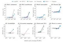 Performance of bigger models on various tasks, when plotted on a log-log scale, appears as a linear extrapolation of performance achieved by smaller models. However, this linearity may be punctuated by "break(s)"[83] in the scaling law, where the slope of the line changes abruptly, and where larger models acquire "emergent abilities".[37][84] They arise from the complex interaction of the model's components and are not explicitly programmed or designed.[2]