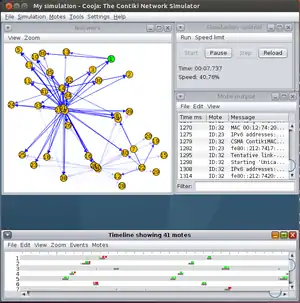 ![]() Screenshot of an Ubuntu system showing Contiki 2.6 running on 41 nodes forming an IPv6-RPL-6LoWPAN network in the Cooja Contiki network simulator. | |