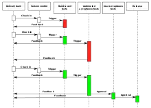 Continuous delivery treats the commonplace notion of a deployment pipeline[3] as a lean Poka-Yoke:[4] a set of validations through which a piece of software must pass on its way to release. Code is compiled if necessary and then packaged by a build server every time a change is committed to a source control repository, then tested by a number of different techniques (possibly including manual testing) before it can be marked as releasable.