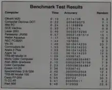 The Creative Computing Benchmark, also called Ahl's Simple Benchmark, is a computer benchmark that was used to compare the performance of the BASIC programming language on various machines. It was first introduced in the November 1983 issue of Creative Computing magazine with the measures from a number of 8-bit computers that were popular at the time. Over a period of a few months, the list was greatly expanded to include practically every contemporary machine, topped by the Cray-1 supercomputer, which ran it in 0.01 seconds.[lower-alpha 1]