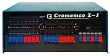 The first computer released by Cromemco was the Z-1 in August 1976.[17] The Z-1 came with 8K of static RAM and used the same chassis as the IMSAI 8080 but featured the Z80 microprocessor rather than the IMSAI computer's Intel 8080 chip.[18] The Z-1 was succeeded by the Z-2 in June 1977, which featured 64K of RAM[19] and the ability to run Cromemco DOS (CDOS), a CP/M-like operating system.[20] The Z-2 also added a parallel interface in addition to an RS-232C serial port and no longer included the large panel of switches that had been part of the Z-1 model.