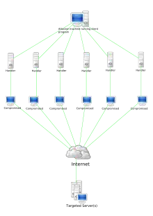 If an attacker mounts an attack from a single host, it would be classified as a DoS attack. Any attack against availability would be classed as a denial-of-service attack. On the other hand, if an attacker uses many systems to simultaneously launch attacks against a remote host, this would be classified as a DDoS attack. Malware can carry DDoS attack mechanisms; one of the better-known examples of this was MyDoom. Its DoS mechanism was triggered on a specific date and time. This type of DDoS involved hardcoding the target IP address before releasing the malware and no further interaction was necessary to launch the attack. A system may also be compromised with a trojan containing a zombie agent. Attackers can also break into systems using automated tools that exploit flaws in programs that listen for connections from remote hosts. This scenario primarily concerns systems acting as servers on the web. Stacheldraht is a classic example of a DDoS tool. It uses a layered structure where the attacker uses a client program to connect to handlers, which are compromised systems that issue commands to the zombie agents, which in turn facilitate the DDoS attack. Agents are compromised via the handlers by the attacker. Each handler can control up to a thousand agents.[48] In some cases a machine may become part of a DDoS attack with the owner's consent, for example, in Operation Payback, organized by the group Anonymous. These attacks can use different types of internet packets such as TCP, UDP, ICMP, etc.