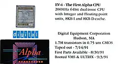 | EV4 | 21064 | 1992 | 100–200 | 0.75 | 1.68 | 234 | 290 | 30 | 3.3 | 8 | 8 | – | 128 KB–16 MB | ||