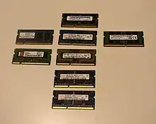 A SO-DIMM (pronounced "so-dimm" /ˈsoʊdɪm/, also spelled "SODIMM") or small outline DIMM, is a smaller alternative to a DIMM, being roughly half the physical size of a regular DIMM. The first SODIMMs had 72 pins and were introduced by JEDEC in 1997.[8][9][10] Before its introduction, many laptops would use proprietary[11] RAM modules which were expensive and hard to find.[8][12]