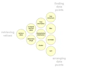Users may have particular data points of interest within a data set, as opposed to the general messaging outlined above. Such low-level user analytic activities are presented in the following table. The taxonomy can also be organized by three poles of activities: retrieving values, finding data points, and arranging data points.[78][79][80][81]