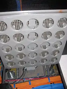 Another option is fitting cabinets with vertical exhaust duct chimneys.[68] Hot exhaust pipes/vents/ducts can direct the air into a Plenum space above a Dropped ceiling and back to the cooling units or to outside vents. With this configuration, traditional hot/cold aisle configuration is not a requirement.[69]