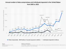 The first reported data breach occurred on 5 April 2002[8] when 250,000 social security numbers collected by the State of California were stolen from a data center.[9] Before the widespread adoption of data breach notification laws around 2005, the prevalence of data breaches is difficult to determine. Even afterwards, statistics per year cannot be relied on because data breaches may be reported years after they occurred,[10] or not reported at all.[11] Nevertheless, the statistics show a continued increase in the number and severity of data breaches that continues as of 2022.[12] In 2016, researcher Sasha Romanosky estimated that data breaches (excluding phishing) outnumbered other security breaches by a factor of four.[13]