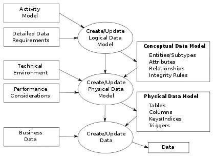 The figure illustrates the way data models are developed and used today. A conceptual data model is developed based on the data requirements for the application that is being developed, perhaps in the context of an activity model. The data model will normally consist of entity types, attributes, relationships, integrity rules, and the definitions of those objects. This is then used as the start point for interface or database design.[5]