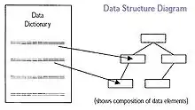A data structure diagram is a diagram type that is used to depict the structure of data elements in the data dictionary. The data structure diagram is a graphical alternative to the composition specifications within such data dictionary entries.[1]