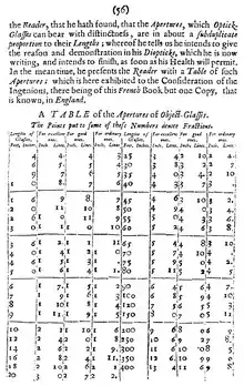 Adrien Auzout's "A TABLE of the Apertures of Object-Glasses" from a 1665 article in Philosophical Transactions