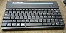 In February 1993,[13] Dauphin unveiled the DTR-1 (an abbreviation of Desktop Replacement-1), a touchscreen palmtop PC weighing 2.5 pounds (1.1 kg), measuring 9 by 5 by 1.5 inches (22.9 by 12.7 by 3.8 cm),[14]: 39 and running Cyrix's Cx486SLC microprocessor and Microsoft's Windows for Pen Computing operating system.[14]: 37 The DTR-1 can be used as a more standard subnotebook by placing it within its carrying case, which also houses the computer's included keyboard, or it can be used like a PDA sans keyboard.[14]: 39 IBM signed a contract with Dauphin to manufacture the DTR-1 in unused production facilities in Austin, Texas, in May 1993.[15][16][17] Hewlett-Packard provided the DTR-1's hard disk drive, which were Kittyhawk microdrive units measuring 1.3 inches in diameter (as opposed to the 2.5-inch diameter drives used in most laptops of the time).[18] The DTR-1 was released in mid-1993 to tepid sales and mixed reviews from technology journalists,[19][20] who complimented its small stature but found the hardware underpowered and the small keyboard cumbersome to use.[21][22]