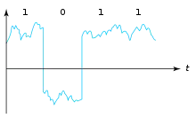 In digital communications, a digital signal is a continuous-time physical signal, alternating between a discrete number of waveforms,[3] representing a bitstream. The shape of the waveform depends the transmission scheme, which may be either a line coding scheme allowing baseband transmission; or a digital modulation scheme, allowing passband transmission over long wires or over a limited radio frequency band. Such a carrier-modulated sine wave is considered a digital signal in literature on digital communications and data transmission,[11] but considered as a bit stream converted to an analog signal in electronics and computer networking.[12]
