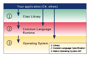 The Portable .NET class library seeks to provide facilities for application development. These are primarily written in C#, but because of the Common Language Specification they can be used by any .NET language. Like .NET, the class library is structured into Namespaces and Assemblies.[2] It has additional top-level namespaces including Accessibility and DotGNU. In a typical operation, the Portable .NET compiler generates a Common Language Specification (CLS) image, as specified in chapter 6 of ECMA-335, and the Portable .NET runtime takes this image and runs it.