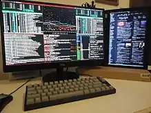 dwm supports multiple workspaces and, unlike ratpoison, allows moving and resizing windows with the mouse.[11] Older versions of dwm displayed their stdin in a status bar, along the edge of the screen. Recent versions instead display the root window's name, which can be set by independent processes. This is often used to show information that would appear in the notification area of other desktop environments—a clock, system load info, laptop battery and network status, music player information and the like. This status line is often complemented with dmenu, a textual application launcher from the same developers as dwm. dwm uses a focus-follows-mouse model and lacks any window decoration other than a border to show focus. Since dwm's configurability amounts to patching the source code, many other options are possible.[12]