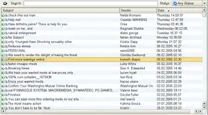 - Some spam may appear to be blank when in fact it is not. An example of this is the VBS.Davinia.B email worm[18] which propagates through messages that have no subject line and appears blank, when in fact it uses HTML code to download other files.